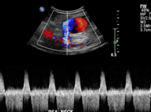 A imagem de ultrassom acima mostra um pseudoaneurisma decorrente da artéria femoral profunda esquerda.