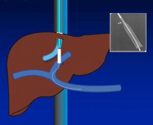 A figura acima ilustra o implante de stent no procedimento do TIPS entre a veia porta e a veia supra-hepática média