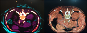 A imagem acima ilustra a agulha inserida no interior da lesão e em seguida  a necrose resultante deste tipo de tratamento englobando toda a massa tumoral.